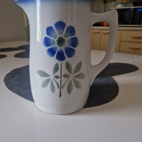 Arabia kannu purjevene-kuviolla. Valkoinen keramiikkakannu, jossa sininen purjevene-aihe ja sinisävyinen reuna. Kannussa on kaatonokka ja suuri kahva, mikä helpottaa kaatamista. Pohjassa Arabia Made in Finland -leima. Kannu on ehjä, pohjassa on kulumaa, näkyy kuvassa. Ei postitusta.