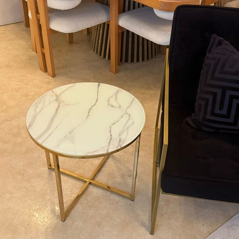 Siistikuntoinen ja tukeva valkoinen sohvapöytä. Hopean väriset jalat.
