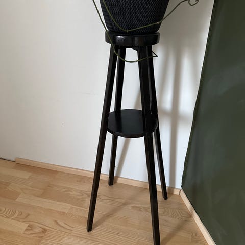 Metallirunkoinen kukkahylly, jossa kaksi mahonkiviilutettua levytasoa sekä valkoinen kukkien kiipeilyteline (irrotettava). Pieniä jälkiä tasoissa.