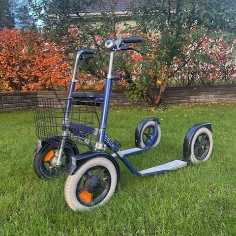 Hyväkuntoinen rollaattori ilmakumirenkailla. Helposti purettavissa ja koottavissa kuljetusta varten.