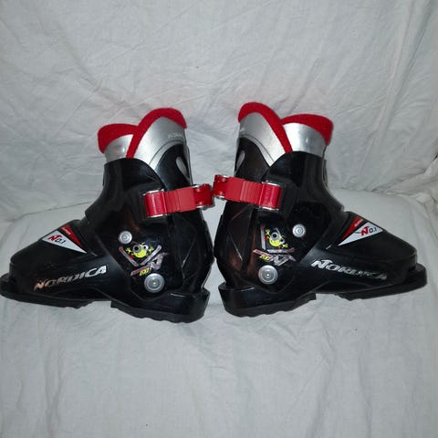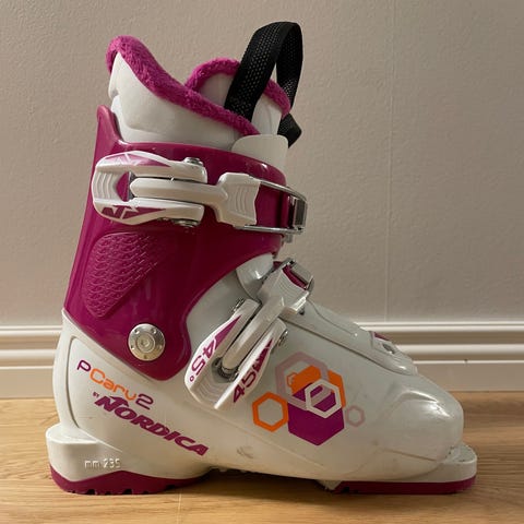 Nordica ACarv 2 lasten laskettelumonot. Kengän kokomerkintä 18,0–19,5 (pohjan pituus 235 mm). Väri pääosin musta, siniset pohjat ja vihreät soljet. Monossa on kaksi säädettävää solkea ja tarrasulku varressa. Pehmustettu sisäosa tuo tukea ja mukavuutta lapsen jalalle. Sopivat alppisuksiin, joissa siteet säädettävissä 235 mm pohjan pituudelle.