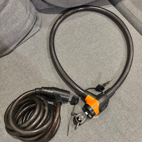 Kaksi kappaletta polkupyörän lukkoa, värit ovat liila ja limenvihreä.