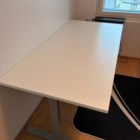 Myydään kuvanmukainen Ikean Bekant työpöytä. 120cm leveä ja 80cm syvä. Pöytälevyn alapuolella johdoille irrotettava verkkopussukka. Korkeus säädettävissä.