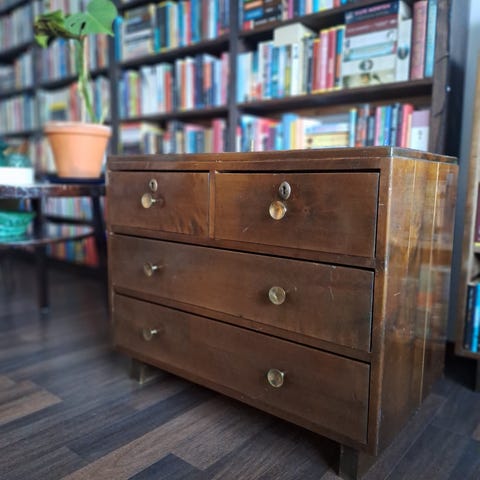 Laatikot liikkuu hyvin. Yleisilme siisti, mutta viilupinnassa paikoin halkeamia, katso kuvat.