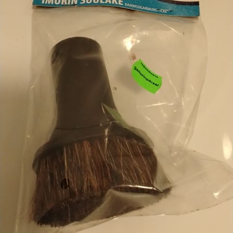 Uusi imurin lisäsuutin jossa harjaosa ja toisessa päässä sametti jolla harjata+imuroida karvoja ja nukkaa. Mukana teline jolla voi kiinnittää imurin varteen helppoa käyttöönottoa varten. Merkistä ei tietoa.