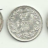 Suomen suuriruhtinaskunnan 25 penniä kolikkoja 6 erilaista, vuosilukuja näkyvissä 1891, 1994, 1897, 1901, 1907, 1909. Materiaalina hopea tai hopeaseos. Etupuolella arvomerkintä ”25 penniä” ja vuosiluku, reunaa kiertävä koriste. Kääntöpuolella kaksipäinen vaakuna. Sopii kokoelmiin tai numismatiikan harrastajalle historiallisina Suomen suuriruhtinaskunnan aikaisina kolikoina. hinta 12 e posti 2.50 e