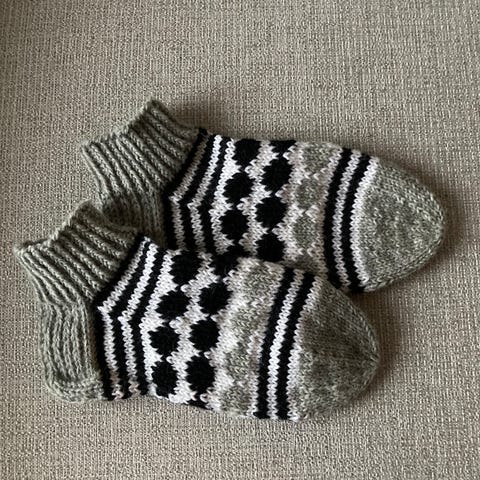 Kudottu 7veljestä langasta, pohjan pituus 24cm. Koko noin 39. Nouto tai postitus.