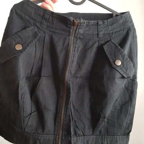 H&M Divided naisten minihame, koko 36. Malli on lyhyt, suoralinjainen nappihame. Väri musta. Materiaali on jäljittelee mokkaa, sisäpuolella sileä vuori. Edessä napitus alas asti ja tasku. Sopii arki- ja vapaa-ajan käyttöön.