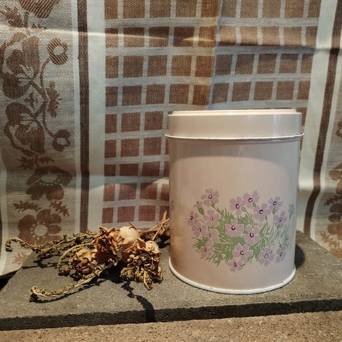 G.W. Sohlberg Ab/Vilèn vanha peltipurkki. Tarkkaa valmistusvuotta en tiedä mutta GWS osti Vilènin 60-luvun alussa, joten joskus sen jälkeen tehty. Saattaa olla myös Vilènin valmistama eli vanhempi, koska tässä ei ole GWS:n merkkiä. En ihan tarkkaan tiedä näiden historiaa. Paksua peltiä, ei sellaista rimpulaa kuin nykyään näkee. Maalipinnassa iän tuomaa kulumaa/pientä naarmua, kansi lähes virheetön mutta ikäisekseen varsin siistissä ja edelleen käyttökelpoisessa kunnossa. Itse olen pitänyt näissä kuiva-aineita niin, että ne ovat olleet myyntipakkauksissaan (esimerkiksi sokeria ja korppujauhoja). Ihastuttava lisä keittiöön, jota ei halua piilottaa kaappiin! 🌼 Korkeus noin 15cm, pohjan halkaisija noin 13cm.