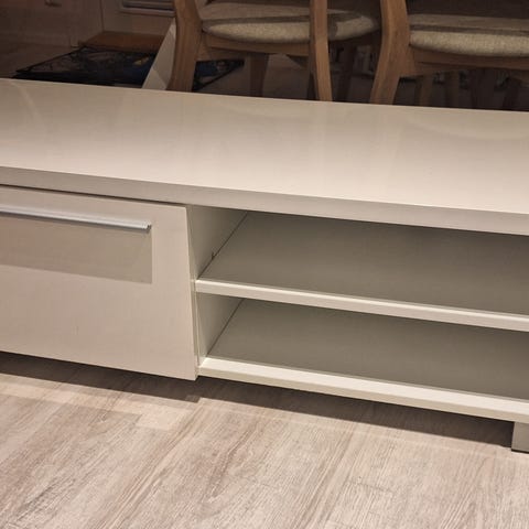 Jyskistä ostettu tv-taso. Hyvässä kunnossa muuten, mutta hylly irronnut ja yksi kiinnikkeistä hukkunut matkassa. 10€ ja haku Nivavaarasta.
