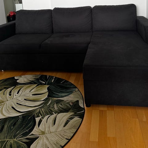 Musta/tumma divaanisohva. Muistaakseni Sotkasta alunperin ostettu. Hyvässä kunnossa, ei ole ollut eläintaloudessa, levitettävän osan reunassa hieman kangas revennyt.