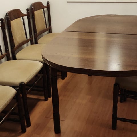 Hieno ryhmä. Lasivitriini, senkki, ruokapöytä ja 6 tuolia sekä puhelinpöytä. Hyvin pidetyt. Todella kauniit.