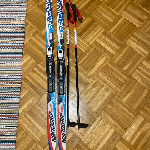 Vähän käytetyt uuden veroiset Peltosen sukset ja Apollo Rex sauvat 115cm
