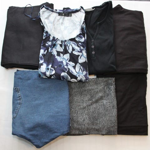 Naisten vaatepaketti koossa XL-XXL. Suurin osa XL ja jokunen XXL. Vaatteita 27 kpl sisältäen toppeja, t-paitoja, tunikoita, caprit, housuja, ulkoilutakki, sukkahousut, leggingsit, mekkoja, pitkä villapaita.