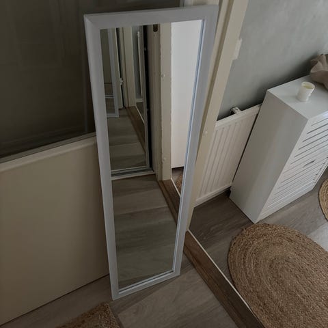 Jysk kokovartalopeili valkoinen. Peilissä on kapea, suorakulmainen muoto ja koristeltu kehys. Sopii esimerkiksi makuuhuoneeseen tai eteiseen pukeutumis- ja sisustuspeiliksi seinälle nojaavaksi tai seinään kiinnitettäväksi, asennustavasta riippuen.ovh 99e