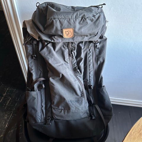 Fjällräven Abisko Friluft 45 litraa. Rinkkaa on käytetty vain muutaman kerran. Rinkassa on tilava päätasku, useita ulkotaskuja sekä kompressiohihnat sivuilla. Päätasku aukeaa sekä ylhäältä että edestä. Selkäosa on hengittävä ja säädettävä, ja olkaimet sekä lantiovyö ovat pehmustetut, mikä tukee kantomukavuutta pidemmillä vaelluksilla. Mukana tulee erillinen sininen Fjällräven-sadesuoja, joka suojaa repun sisältöä sateelta. Rinkka soveltuu vaellukseen, retkeilyyn ja matkakäyttöön.