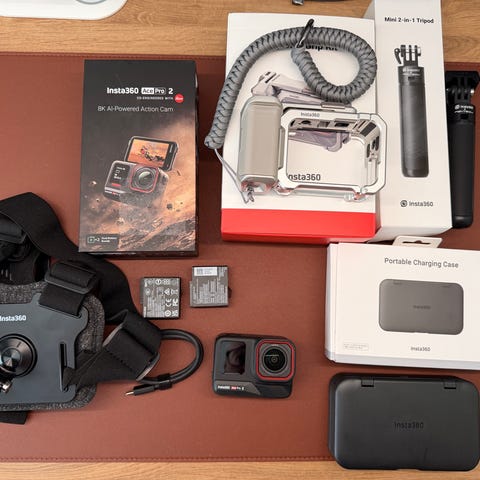 Insta360 One R actionkamera. Pakettiin sisältyy kamerarunko, modulaariset kamerayksiköt, suojakotelo sekä erilaisia kiinnitysosia ja lisävarusteita. Sopii esimerkiksi urheilu- ja matkakuvaukseen sekä videoiden tallentamiseen eri kuvakulmista.