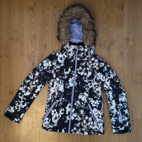 Roxy (Quicksilver) ulkoilutakki/ laskettelutakki/ lautailutakki. Paljon taskuja. Sisällä pehmeä fleece ja lumitasku. Irroitettava huppu irroitettavalla karvareunuksella.