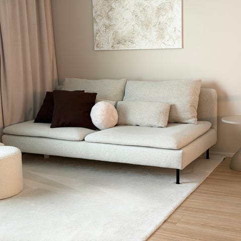 Myynnissä erittäin suuren suosion saavuttanut Ikean Söderhamn sarjan 2 x 1:n istuttava osa. Molempien osien rungot ovat ehjät. Molempiin osiin on meidän toimesta vaihdettu täysin uudet juuri Ikeasta haetut päälliset värissä: Hillared beige. Kyseinen päällinen on valmistettu puuvillasta ja polyesteristä, ja siihen on lisätty viskoosia ja pellavaa. Kestävässä päällisessä on selkeä rakenne, mutta se on myös pehmeä ja mukava. Ryhmän paketti hinta: 429€ tai 229€ / kpl.