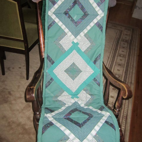 Isöäidin neliöistä tehty kaunis keinutuolinmatto.