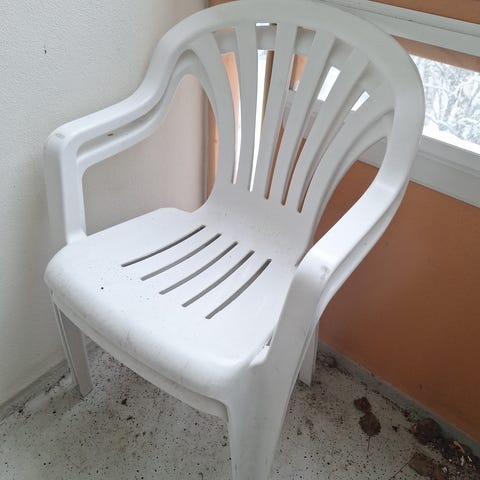 Annetaan kuusi siistiä muovituolia. Väri valkoinen. Ei siis kellastunut. Tässä kesään vierastuoliksi. Pois muuton tieltä.