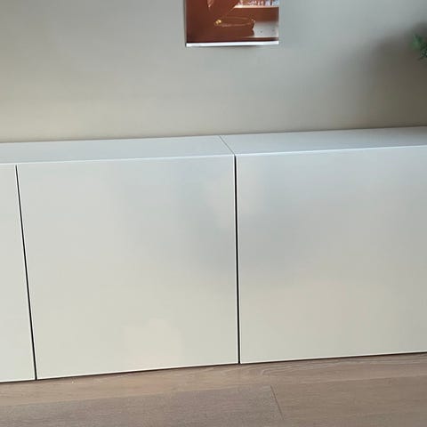 Myydään Ikean Bestå-senkki värissä vaaleaksi petsattu tammikuvio.