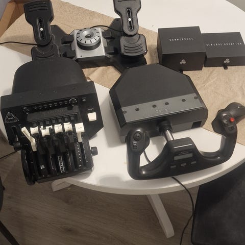 Logitech G Flight Yoke System lentosimulaattorin ohjain ja kaasuvipu. Pakettiin kuuluu ohjaussauva/yoke-yksikkö sekä erillinen kolmen vivun kaasupaneeli, jossa on musta, sininen ja punainen säädin. Sopii tietokoneella käytettäviin lentosimulaattoreihin yhteensopivan ohjelmiston ja liitäntöjen mukaan. Yoke-yksikössä on useita painikkeita ja kytkimiä eri toimintojen ohjaamiseen sekä kiinnitysmekanismi pöytään asennusta varten.