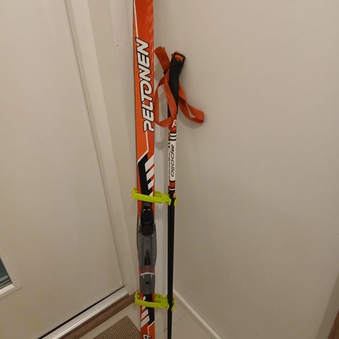 Paljon käytetyt Peltosen sukset, 130cm ja sauvat 95cm. Tussilla nimikoitu.