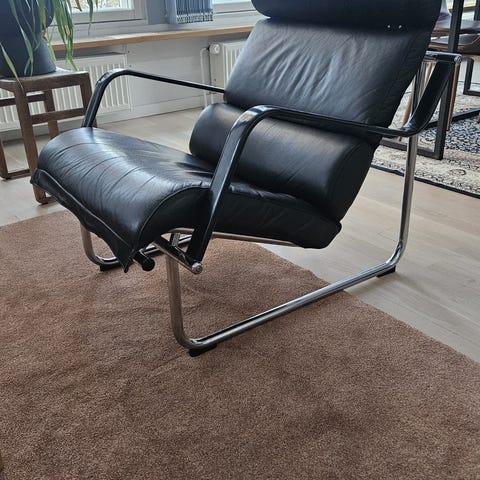 Vuosia lämpimässä varastossa ollut arvokaluste. Muovirunko. Pehmuste on nahkaa venepressukiinnikkeillä. Pyörivä jalusta alumiinia.