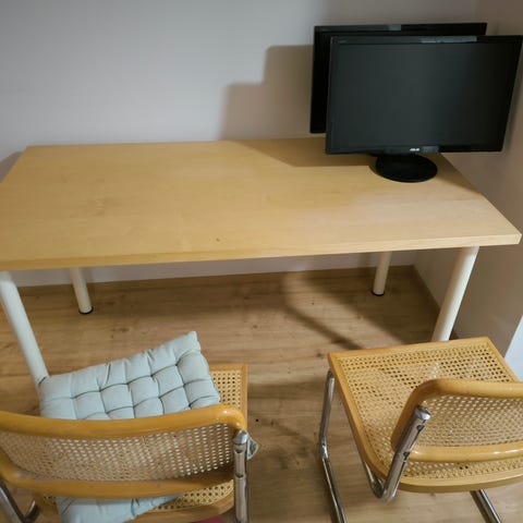 Pitkä Ikean pöytätaso ja siihen erikseen ostetut korkeutta säädettävät jalat. Pöytätasossa vähän käytön jälkiä, mutta jalat ovat kuin uudet. Jalat on helpot kiinnittää pöytätasoon takaisin. Kissatalous.