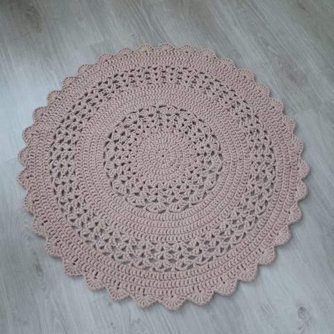 Itsetehty käyttämätön virkattu matto. Halkaisija 90 cm. Konepesun kestävä.