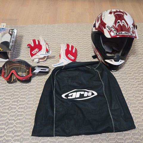 HJC motocross-kypärä koossa XL (62). Väri harmaa mustilla ja valkoisilla kuvioilla. Kypärässä on lippa, leukasuoja ja tuuletusaukot. Paino noin 1300 g, ECE R 22-05 -hyväksyntä. Soveltuu esimerkiksi motocross- tai enduroajoon.