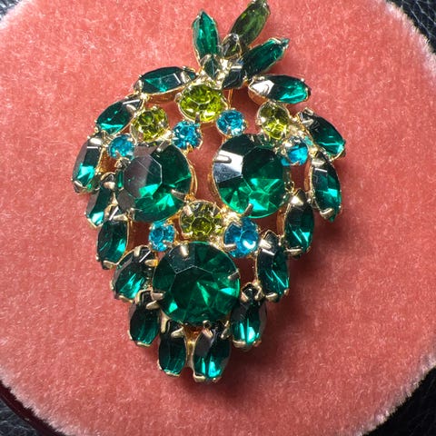Myydään upea ja uniikki vintage-rintakoru, jossa on näyttävä kolmiulotteinen muotoilu. Korussa on suuria, syvän oliivinvihreitä ja kullanruskeita kolmionmuotoisia lasikiviä. Keskellä on yksi upeasti kimalteleva sateenkaarivärinen (Aurora Borealis) kivi, joka antaa korulle hienon säväyksen.