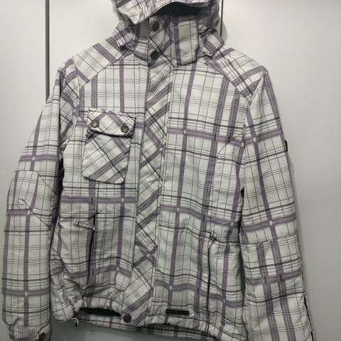 Lila/pinkki kirjava laskettelutakki lumisuojilla. Koko 170/176