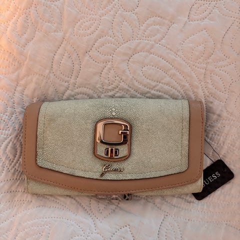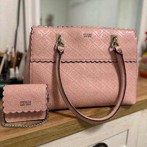 Guess naisten lompakko tekonahkaa. Väri vaaleanpunainen. Lompakossa on vetoketjusuljenta ympäri reunan sekä Guess-logo etupuolella. Sisäpuolella useita lokeroita korteille, seteleille ja kolikoille sekä keskellä vetoketjutasku. Takapuolella erillinen vetoketjutasku pientavaroille. Sopii naisten arkilompakoksi ja korttikukkaroksi.