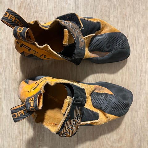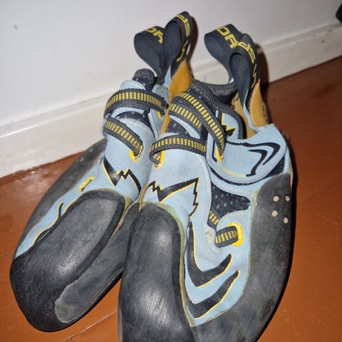 Käytetyt La Sportiva Futura blue mallin kiipeilykengät, koko todennäköisesti 36, mutta kokolappu on kulunut, ei luettavissa. Pohjien käyttöpinta ok kunnossa, ei reikiä kumissa, mutta isovarpaan sivussa pieni reiän alku, ja joku reuna repsottaa hieman. (ks kuvat). Paljon käyttöikää jäljellä ennen kuin vaatii pohjausta.
