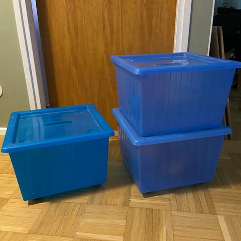 Myydään 2 ehjää Ikean vihreää vessla 39x39cm säilytyslaatikkoa pyörillä.