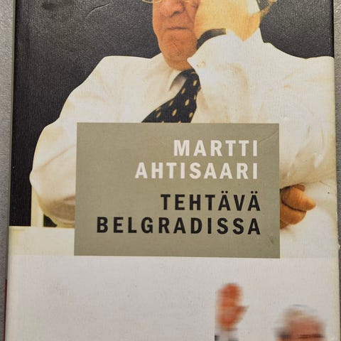 Martti Ahtisaari: Tehtävä Belgradissa. Kirjassa presidentti Ahtisaaren nimikirjoitus ja omiste. Rauhan Nobel-voittajan nimikirjoitus on nykyään melko harvinainen.