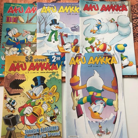 Aku Ankka lehtikansiot punaisella kannella ja Aku Ankka -naamalla 4 kpl ja naurava Aku 2 kpl. Aku Ankka -lehtien säilyttämiseen ja järjestämiseen. Selkämyksessä on paikka numeroiden merkitsemiselle.