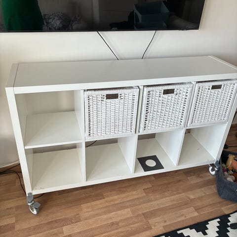 ”Sisustuskalvoitettu” Ikean Kallax taso ja mukaan 6kpl hyllyväleihin mitoitettuja kangaslaatikoita.