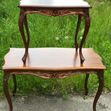 Myydään barokki Kolmen puisen pesäkipöydän setti. Pöydissä on vihreät, kullansävyisillä kuvioilla koristellut pöytätasot, päällä on lasi. Pöydät mahtuvat sisäkkäin tilan säästämiseksi tai niitä voi käyttää erillisinä sivu- tai sohvapöytinä. Käännetyt jalat tuovat perinteisen ilmeen. Soveltuvat esimerkiksi olohuoneeseen tai lukunurkkaukseen laskutasoiksi ja koriste-esineiden esillepanoon.