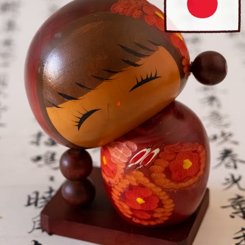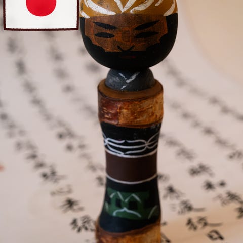 Kaunis ja näyttävä 1960-luvun japanilainen sosaku-kokeshi. Valmistettu massiivipuusta ja viimeistelty lämpimän ruskeilla sävyillä sekä rohkeilla mustilla geometrisilla kuvioilla. Pitkänomainen muoto ja pelkistetty ilme edustavat vahvaa mid-century modern japanilaista minimalismia.