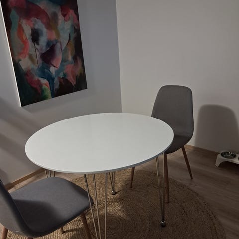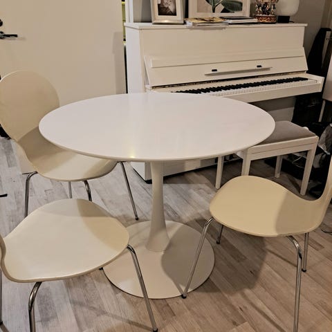 Laulumaa huonekalujen Emilia pyöreä ruokapöytä & Jyskin Ejstrupin tuolit 4kpl