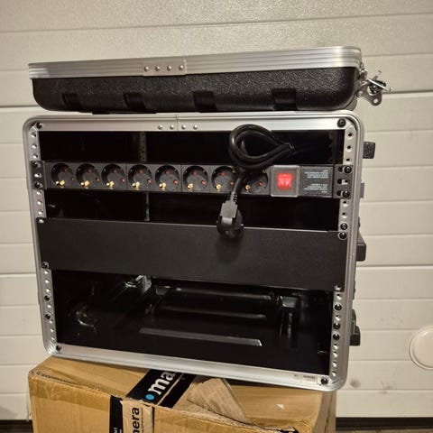 Näppärä 2 unitin räkki etu- ja takakiskoilla. Tämä ei koskaan päätynyt keikkakäyttöön, joten on vielä uudenveroinen. Virallinen tuotenimi: Thon Wireless-Systems Case 2U.