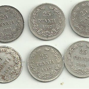 Suomen 25 penniä hopearahat 5 erilaista vuodet 1913, 1915, 1916, 1917I, 1917II leimakiiltoiset. Kolikon toisella puolella on nimellisarvo ja vuosiluku, toisella puolella vaakuna-aihe. Soveltuu esimerkiksi kokoelmiin tai numismatiikasta kiinnostuneille. hinta 10 e posti 2.50 e Yhdistelen postit.