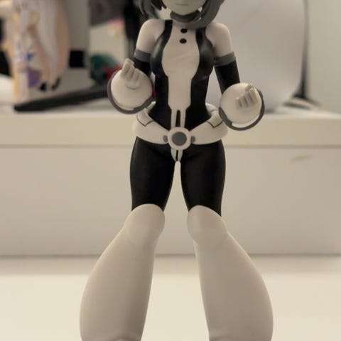 Pieni anime-hahmofiguuri, jossa on ruskeat hiukset ja piirretyn tyylinen ilme. Hahmolla on yllään puku, jossa on tummia ja vaaleita yksityiskohtia. Koko on pieni, suunnilleen AA-pariston mittainen. Sopii esimerkiksi keräilyesineeksi, koristeeksi tai leikkikäyttöön. Muovimainen materiaali.