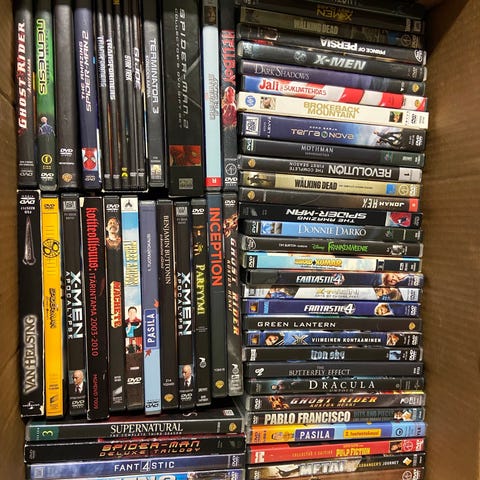 Osa entisiä vuokra-DVD:itä (erottaa kuvasta). Levyt ja kotelot siistejä.