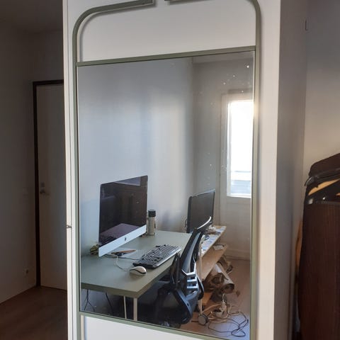 Rusta peili, jossa kapeat mustat kehykset. Sopii esimerkiksi eteiseen tai makuuhuoneeseen kokovartalopeiliksi tai sisustuselementiksi. Peili voidaan kiinnittää seinälle pystyasentoon. Materiaali on lasia ja metallia ovh:59€
