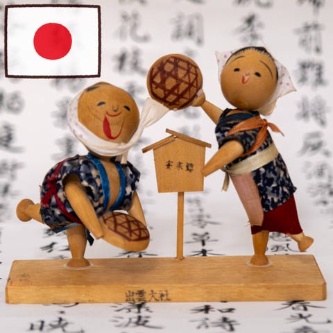 Ihastuttava käsin veistetty ja maalattu puinen rantateemainen pariskunta Japanista. Kyseessä taiteellinen sōsaku-tyylinen figuuripari, jossa mies on rennossa auringonotto- tai uintiasennossa ja nainen istuu hattu selän takana narukiinnityksellä. Ilmeikäs ja humoristinen kokonaisuus, joka edustaa 60-luvun japanilaista kansantaidehenkistä muotokieltä.