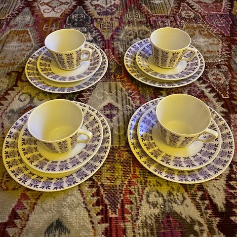 1960-luvun pienet kahvikupit, joissa on herkkä vaalean lila kukkakuvio.